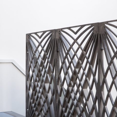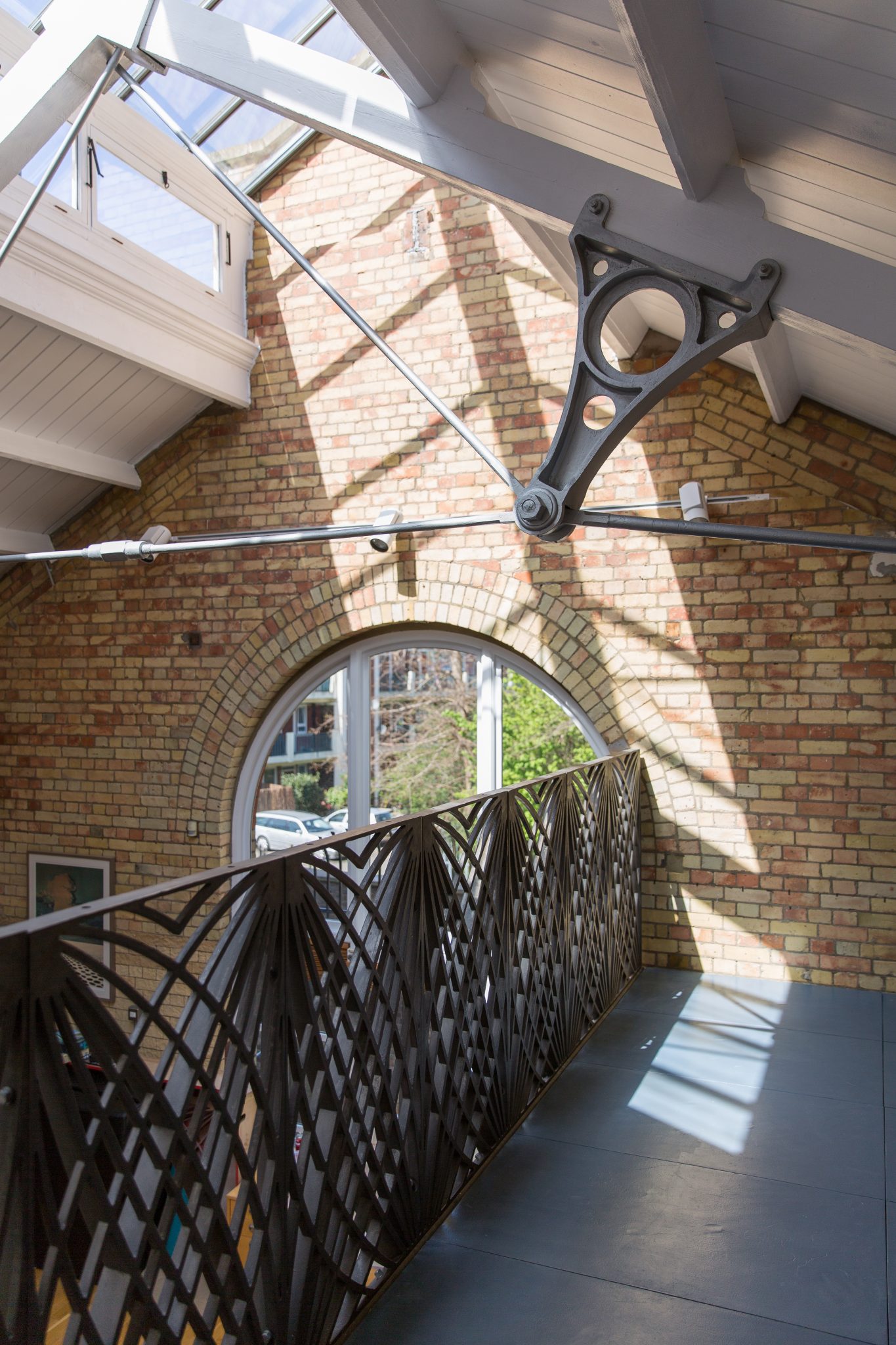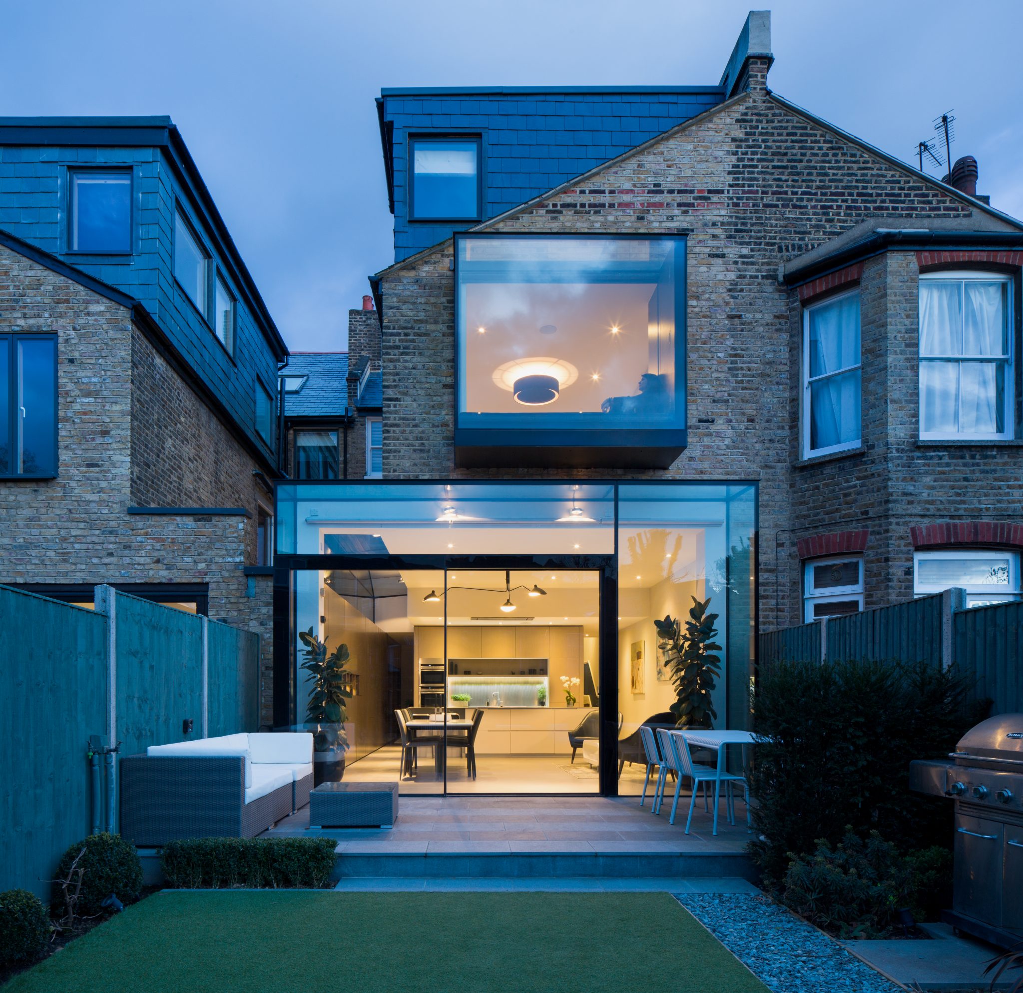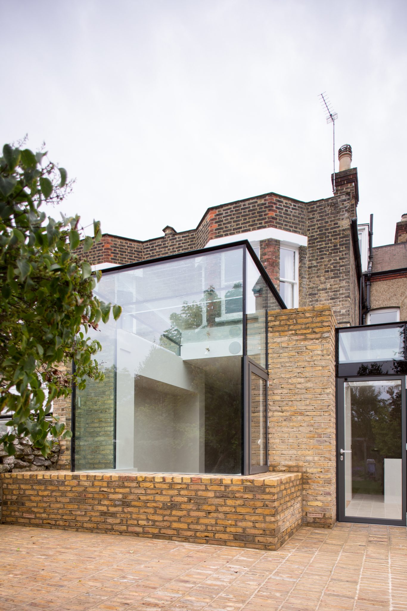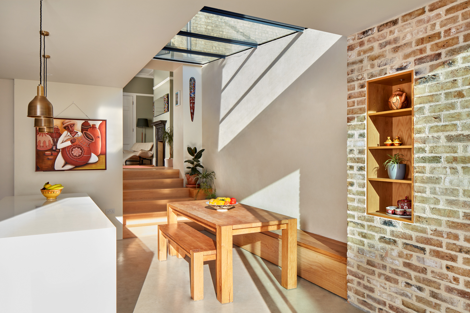 Residential extension designed with exposed brickwork, minimal frame sliding glass doors and large rooflight to create a light and airy space. A high end, bespoke kitchen and built in oak shelves and storage bench complete the design.