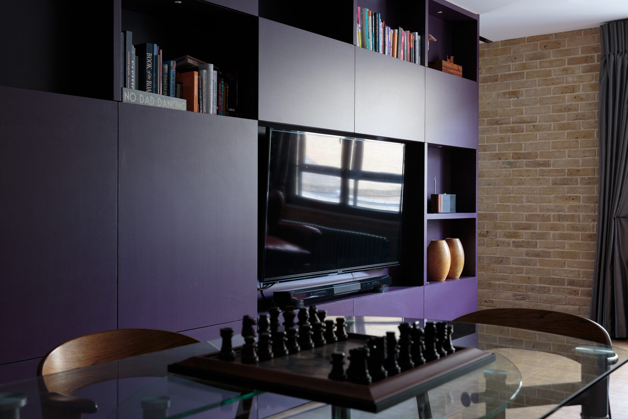 New basement adding guest room and bathroom, office, cinema room and children's play area. Bespoke built in furniture was designed to create ample, beautiful and functional storage. Artificially lit 'rooflights' belie the basement location.